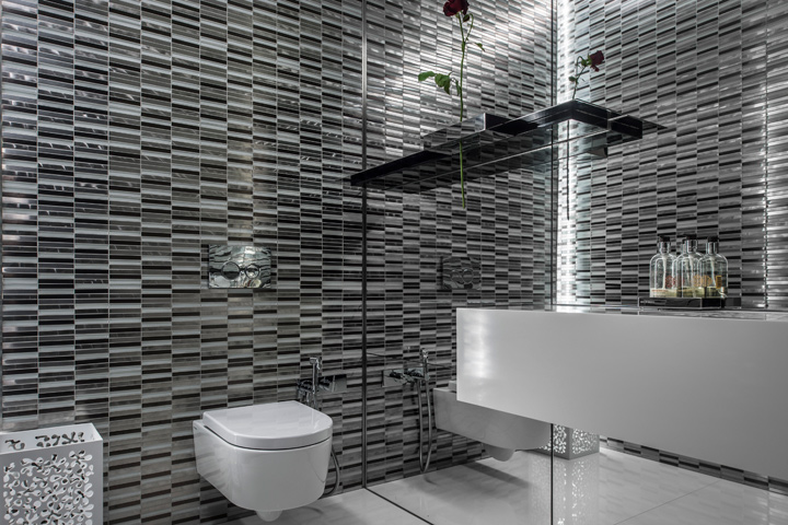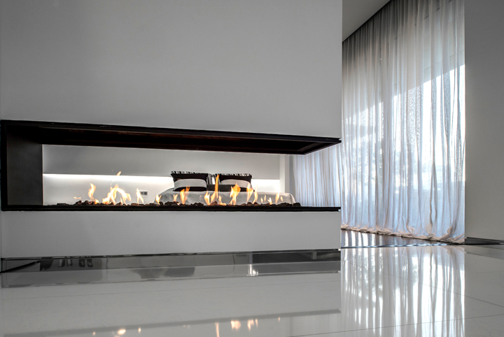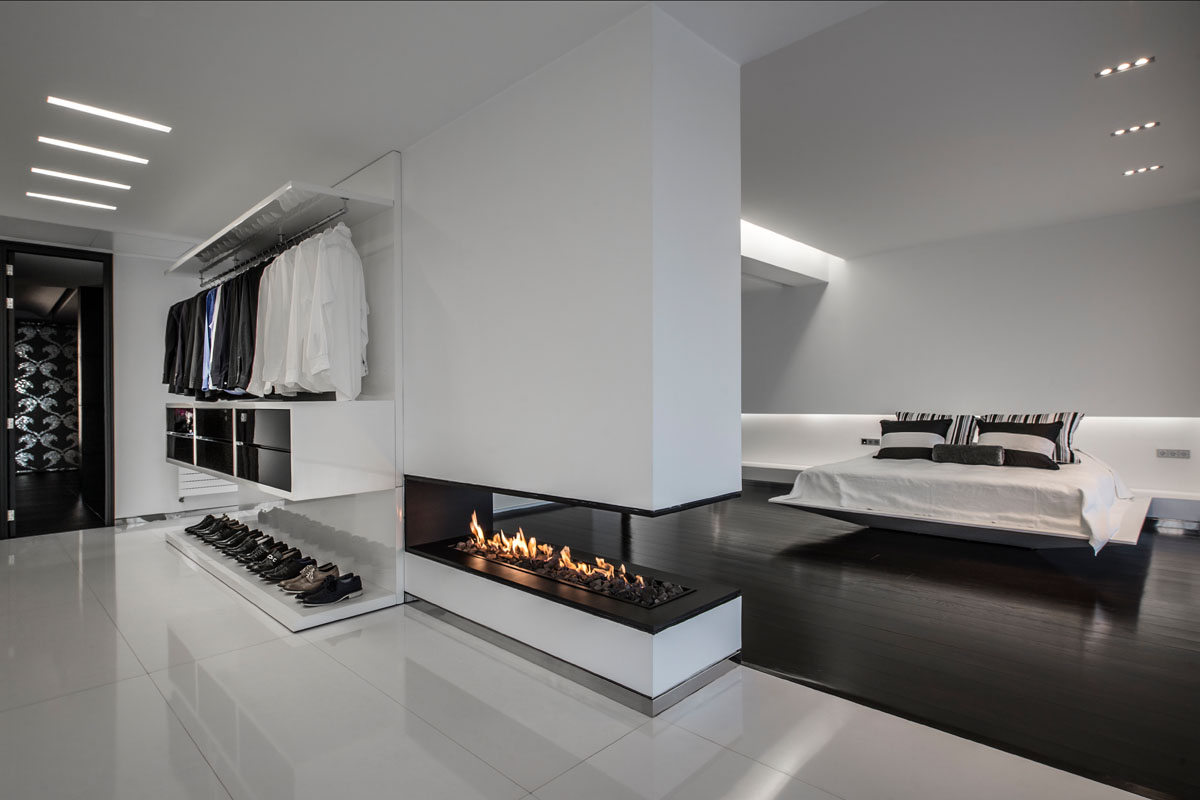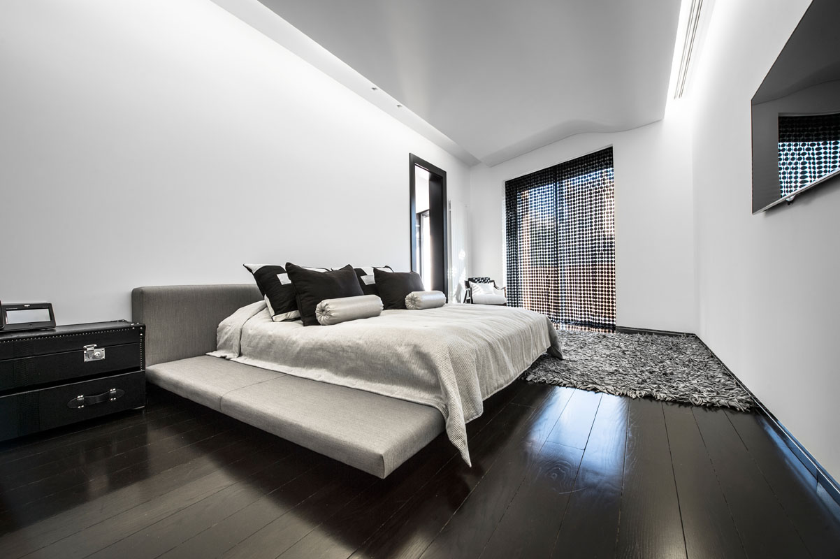 In the master bedroom, black stained oak flooring defines the sleeping quarters, whereas white resin tiles line the dressing room floors. An open fireplace separating the two areas offers stolen glimpses between them, while white linen curtains fold onto the dark floor and soften the silhouettes of the skyline beyond. The romantic feel of the bedroom is uninterrupted in the master bathroom, where the Jacuzzi is elevated against a dark backdrop, animated by the sensual lighting reflected in the mirrors and playful metallic mosaics of the shower wall.