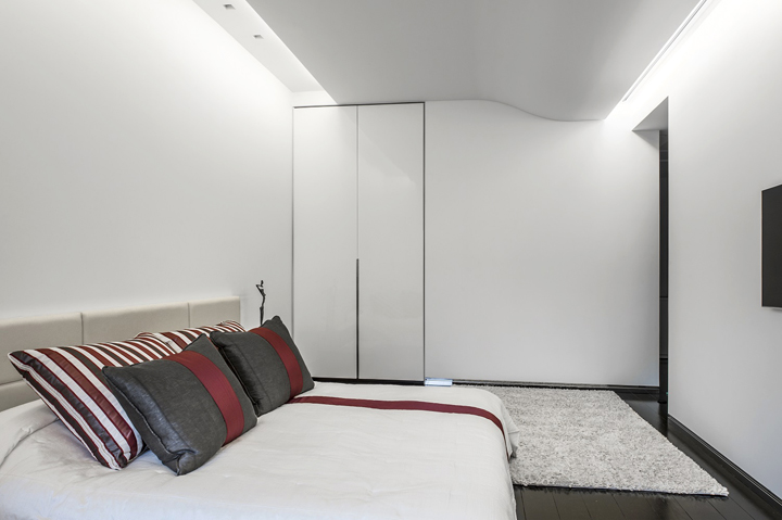 Most of the furniture items in the penthouse have been custom-made by the architect to complement the spaces. These range from the upholstered backless sofas floating throughout the main space, designed to encourage an airy and relaxed atmosphere, to the suspended perforated steel lighting fixtures which animate the dining room, and the seemingly floating beds of the sensual bedrooms.