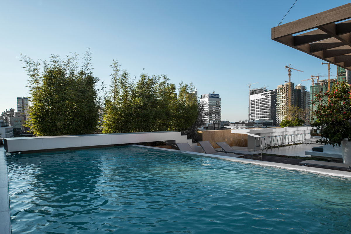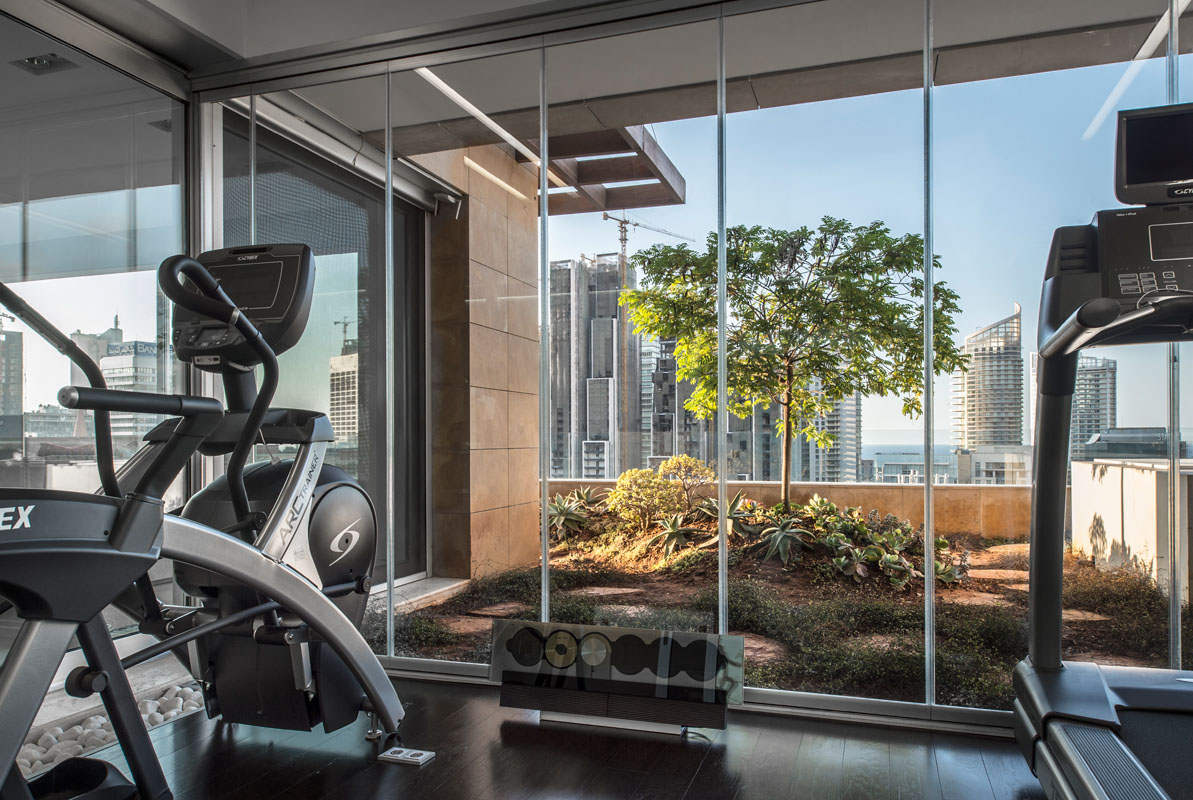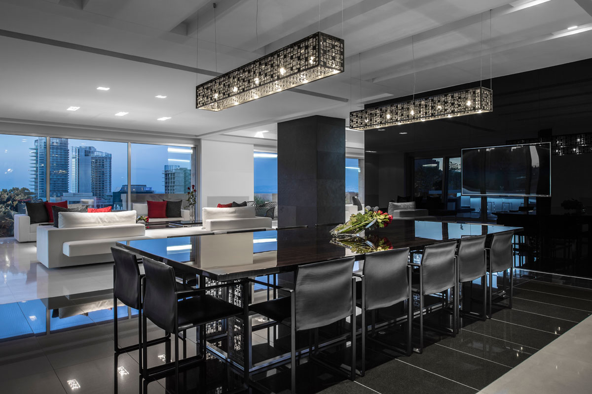 The main entrance of the residence opens up onto a vast living space accommodating a TV area, a formal reception space, as well as the dining room. Fully-glazed and unpartitioned, this area enjoys a wealth of natural light and floor-to-ceiling views of the sea, city and Mount Lebanon. Sliding the glazed panels open allows for the extension of the space to the exterior, merging it with a terrace tastefully landscaped by landscape architect Mohammad Halawi, and featuring a spectacular bar open on three orientations. Stretching along the northern periphery, the far-end of the bar morphs into the steps used to access the swimming pool, where one can soak over the city with unobstructed vistas of the Mediterranean and mountains in the distance.