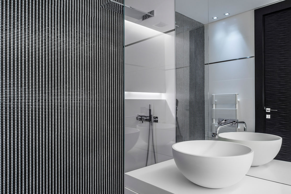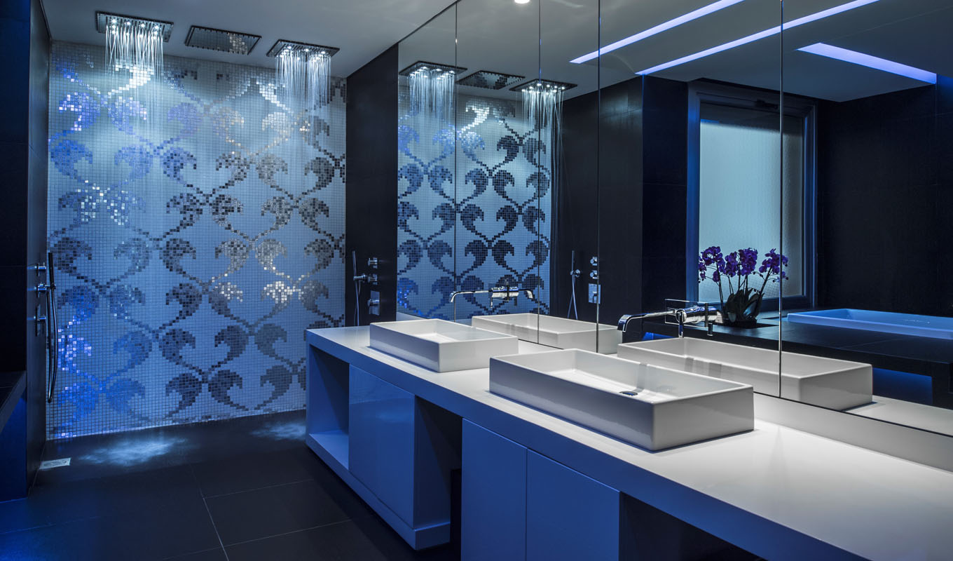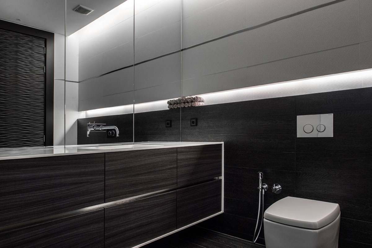 Simultaneously exposed to the interior main space as well as the exterior terrace, a fitness corner outlined with white pebbles can be completely merged with its surroundings by sliding its glass partitions open. Its white Corian-paneled back wall echoes the wave-like texture of the black entrance doors, subtly lit at the joints.