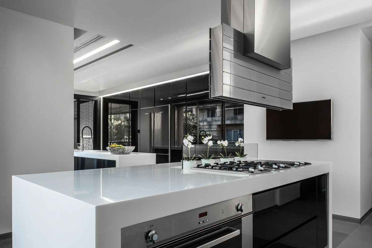 At the entrance, one is greeted with majestic charcoal slate columns, one of which is carved with an open fireplace. Black back-painted mirrored walls and dark granite tiling distinguish the dining room as an independent island amidst the otherwise white space. A passage to the private quarters is delineated with the use of the same granite, along which matt black textured wood doors stand tall.