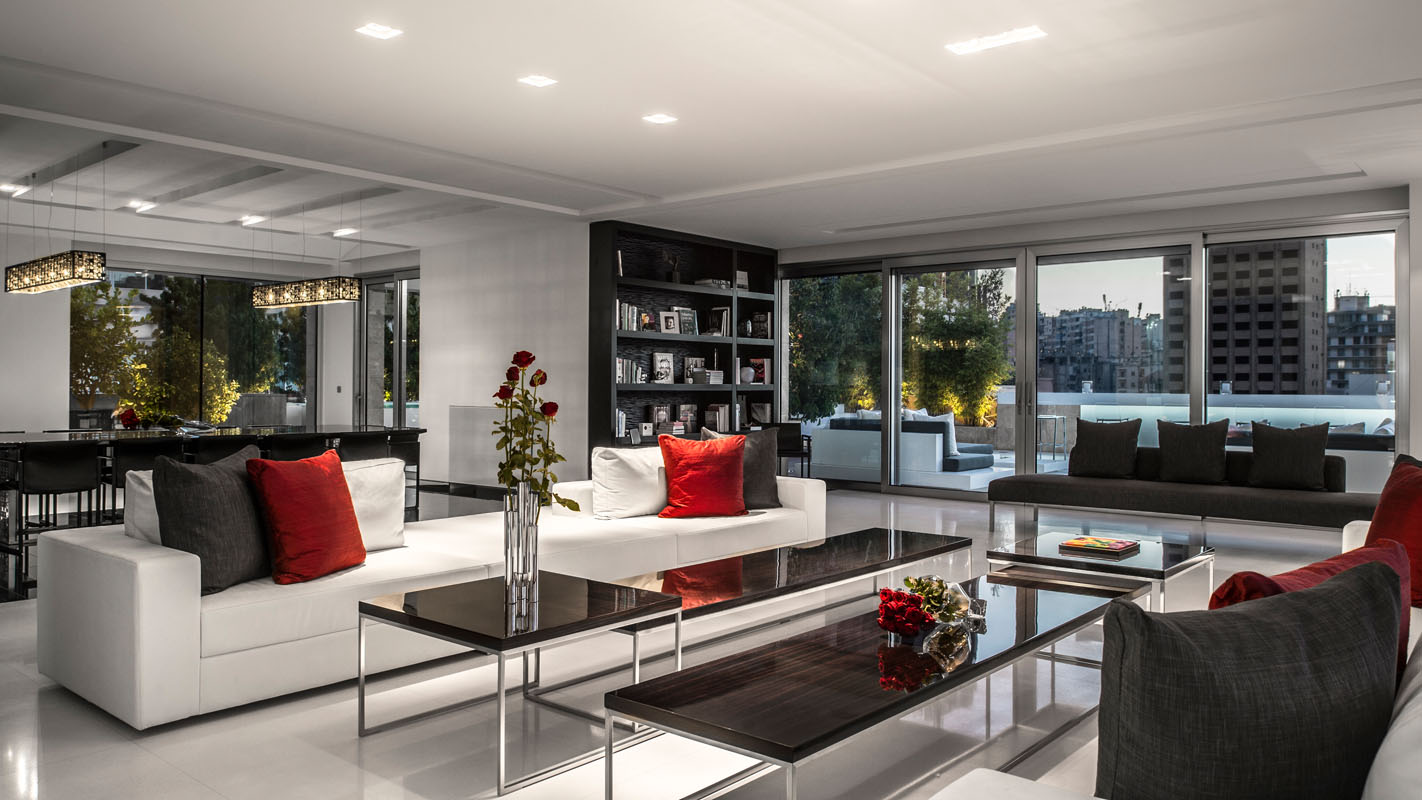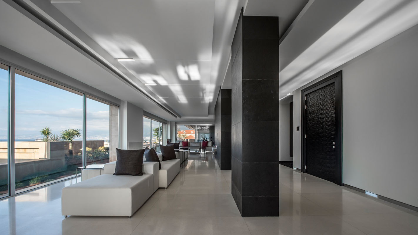Located in Wadi Abou Jamil at the western periphery of Beirut’s city center, the design of this sumptuous 1,200-square-meter penthouse was primarily driven by the desire to create airy spaces uniting comfort and a minimalist feel, while simultaneously embracing the home’s superb geographic location by taking full advantage of its breathtaking peripheral views.